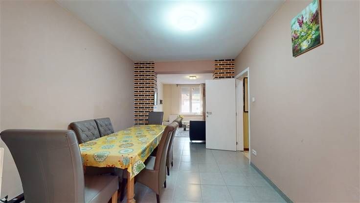 De woning zelf heeft een mooie ruime living met vooraan het salon. Verder naar achter ligt de leefkeuken van iets meer dan 20m². De ingebouwde toestellen en kasten zijn langs de muur.