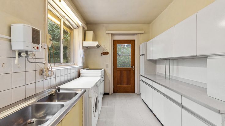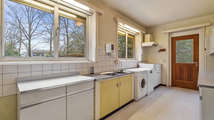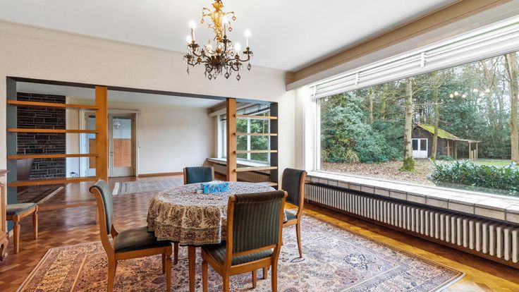 De grote leefruimte en eetkamer genieten erg veel lichtinval door de talrijke ramen. De parketvloer en de houthaard zorgen voor dat tikkeltje extra. Aansluitend is er de keuken. Zoals te zien is op onze digitale renovatie, zijn er veel mogelijkheden met deze ruimtes.