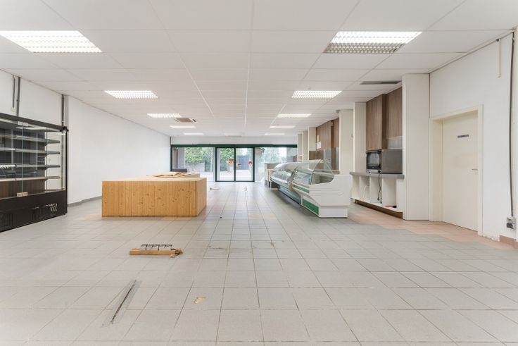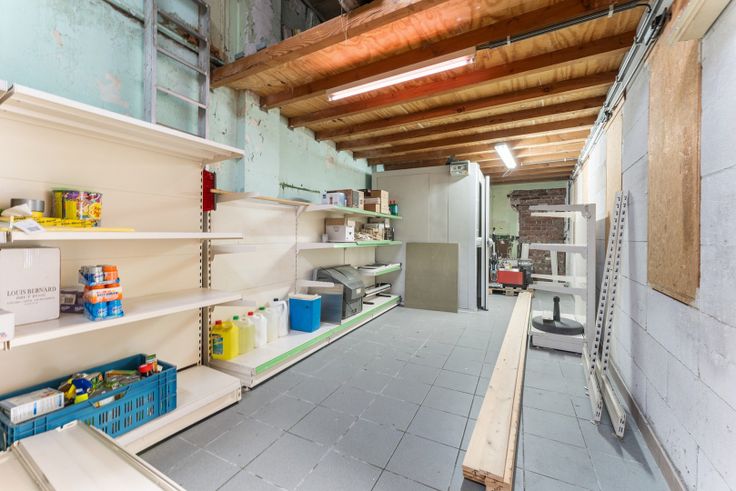 Het ruime handelspand, 234 m², is opgesplitst in winkelruimte, voorraadkamer, bureauruimte, keuken, sanitair gedeelte, opslagruimte met koelcel en zoldering en tenslotte nog een grote garage.