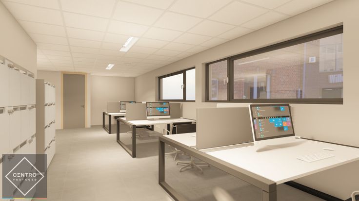 AFWERKING: bevloering met keramische tegels - grote glaspartijen (veel lichtinval) - verlaagd plafond met ingewerkte AIRCO-modules en TL-lampen - aluminium schrijnwerk met dubbele beglazing.