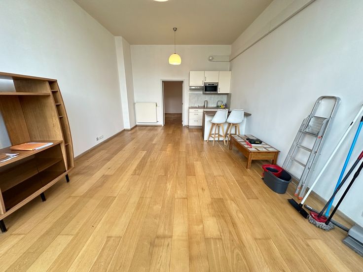 Il se compose d'un grand séjour comprenant une cuisine équipée ouverte (taques deux foyers, frigo encastré, hotte, four, évier, armoires de rangement), une salle de douche avec lavabo simple + WC, une chambre spacieuse de 14 m².