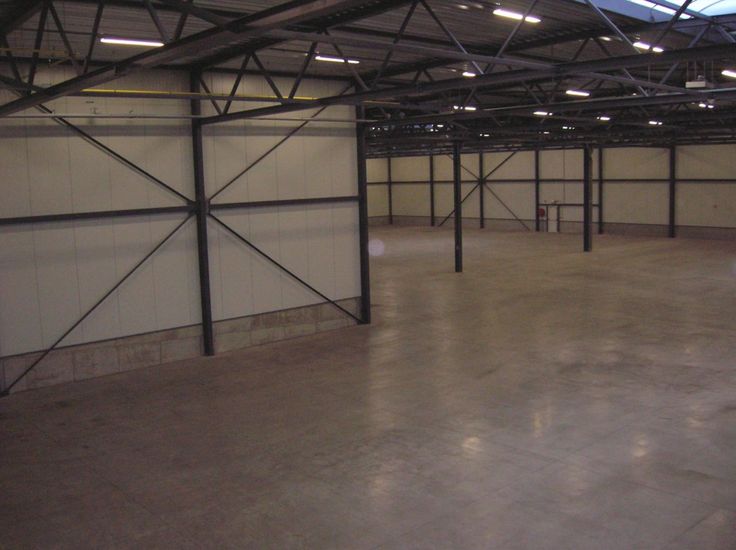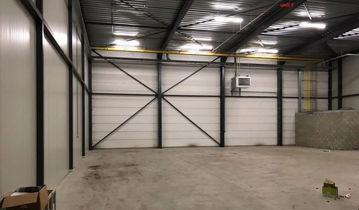 Specificaties: staalstructuur met sandwichpanelen, 8m vrije hoogte, automatische sectionaal poorten, laadkades, polybetonvloer, tl-armaturen, geïsoleerd dak, aerothermen op gas, rookluiken, hoogspanningscabine