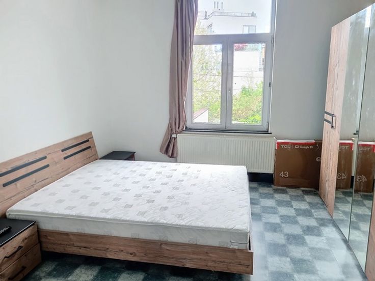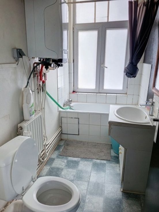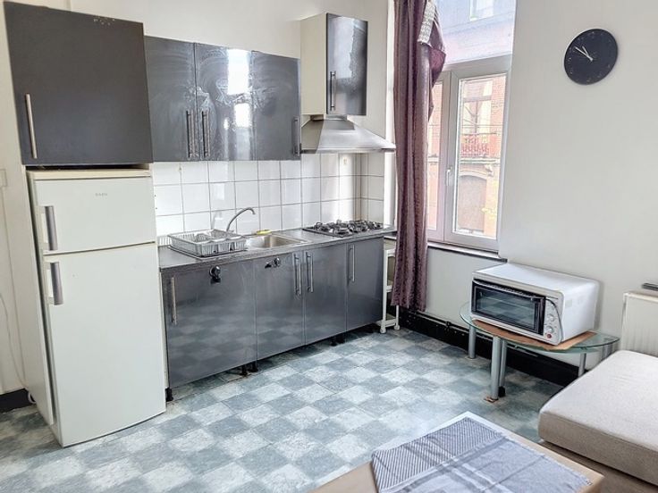 Op de 1e verdieping van een klein gebouw zonder lasten, klein appartement met 1 slaapkamer met hal die direct leidt naar een woon/eetkamer met open inbouwkeuken, een badkamer en een slaapkamer aan de achterkant van 15 m². Moet bijgewerkt worden.