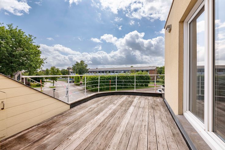 Het eerste verdiep is voorzien van een overloop welke toegang geeft tot de open keuken. De open keuken staat in verbinding met de woonkamer en geeft uit op het zuid-gerichte terras van 15m². Het eerste verdiep omvat nog een ruime berging, een badkamer, afzonderlijk toilet en een slaapkamer.