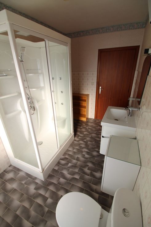 Op het gelijkvloers is er de royale inkom met afzonderlijk toilet, woonkamer met houthaard, afzonderlijke keuken met aansluitend de veranda, nachthall, 4 slaapkamers en ingerichte badkamer.