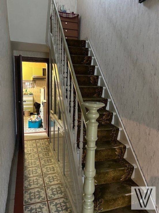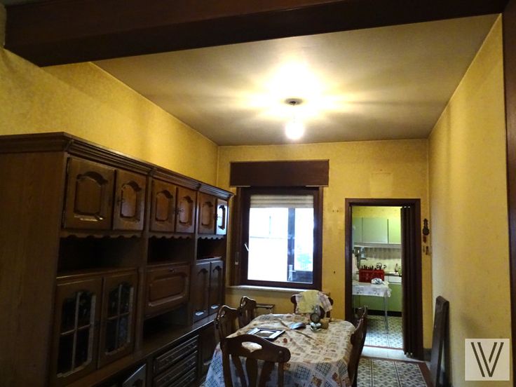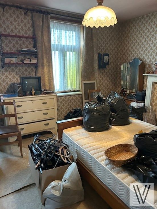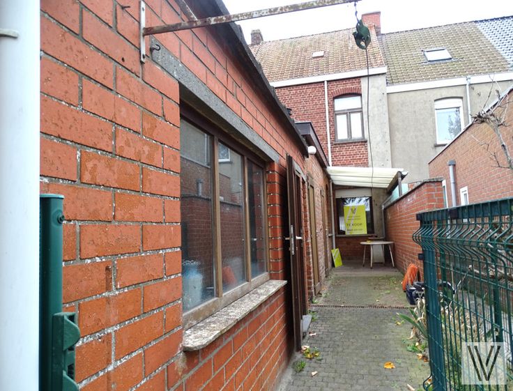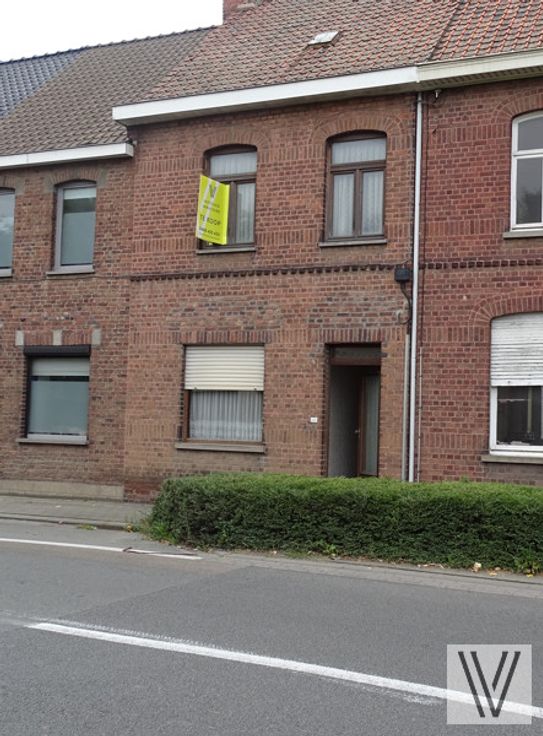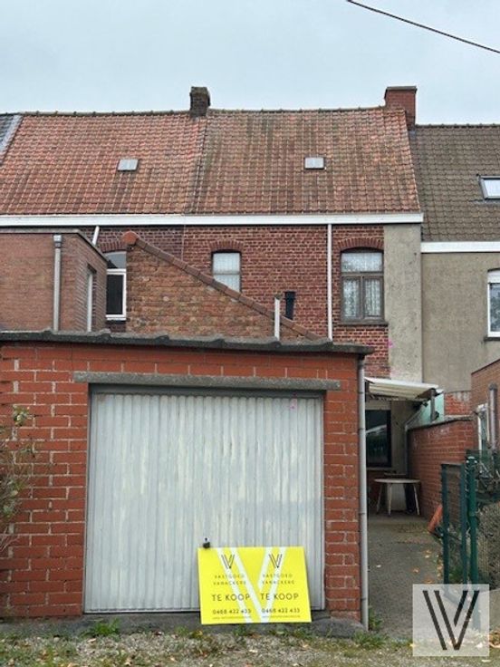 Op te frissen/te renoveren rijwoning met uitweg en afgesloten aanpalende garage bestaande uit de inkom, woon- leefruimte en keuken, aparte douche, kelder en aanpalende bergingen. Er is een vaste trap naar de zolder waar nog mogelijkheid is tot het maken van 2 slaapkamers.