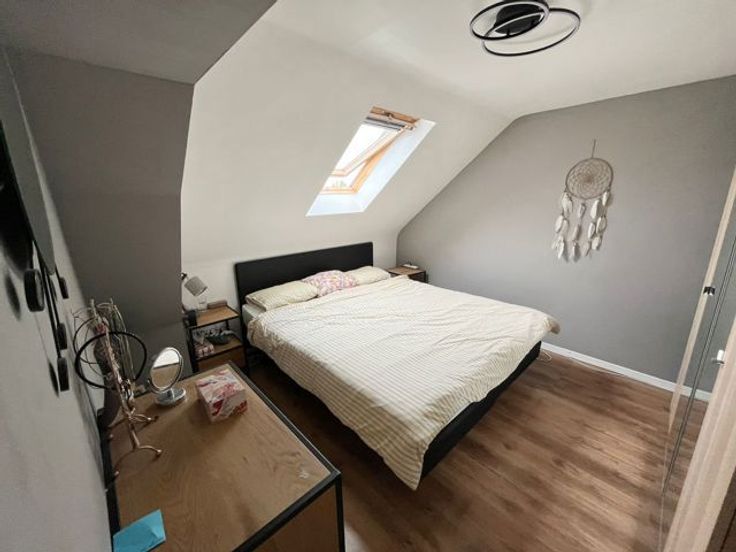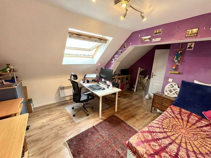 A l’étage, on retrouve un hall de nuit qui dessert la salle bains avec douche italienne, wc et lavabo ainsi que 2 belles chambres de 12,5m2 et 16m2.