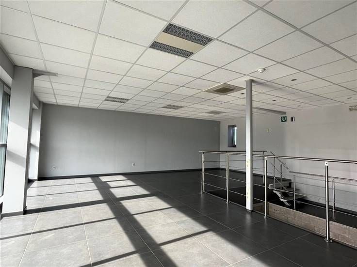 Achteraan het gebouw bevindt er zich een opslagruimte van 590m², inclusief mezzanine die optioneel bij gehuurd kan worden.
