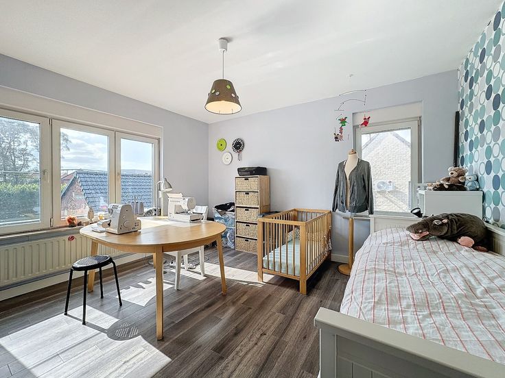 Eerste verdieping: 2 ruime slaapkamers, 1 kleine slaapkamer (of bureau, berging, dressing).
