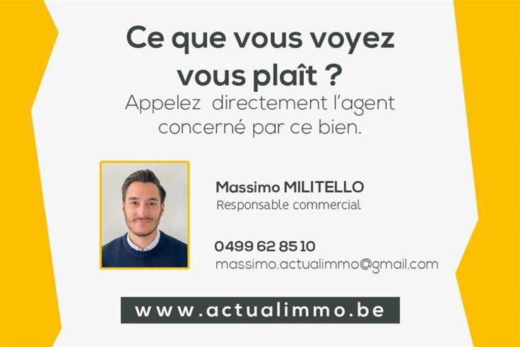 Sous-sol : caves sur 45m2. Extérieur : cour, petite annexe à rénover et terrain. Confort : châssis simple au rez-de-chaussée et châssis double vitrage en PVC à l'étage, chauffage central au gaz de ville. Présence d'une alarme. PEB: F. Revenu cadastral : 1.311 euros. L'immeuble est à rénover dans sa globalité. Les informations publiées sur ce site ont un caractère indicatif et non contractuel. Pour infos et visites, contacter Massimo au 0499 62 85 10. Vous souhaitez vendre votre bien ? N'hésitez pas à contacter notre agence pour une estimation OFFERTE ET SANS ENGAGEMENT. www.actualimmo.be / IPI 800018