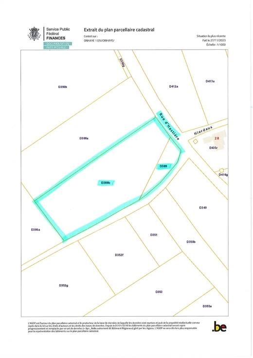 Oyez oyez les investisseurs, les promoteurs, ou tout simplement les amateurs d'une belle et vaste parcelle ! Ce terrain est pour vous ! Magnifique parcelle de 60a84ca entourée de champs à perte de vue, vue de folie . Elle présente une largeur de façade de +/-40Mètres, profondeur gauche +/- 131Mètres, profondeur droite +/- 126Mètres, et +/- 42Mètres en fonds de parcelle. Un beau rectangle actuellement en partie bordé de sapins, qui pourra recevoir votre plus beau projet d'une villa 4 façades ou de 3 constructions moyennant projet à introduire à la commune. La commune d'Onhaye a remis un avis favorable en date du 29/12/2020 pour y construire 3 lots en divisant perpendiculairement la parcelle par rapport à la Nationale 936. Le terrain se situe en zone d'habitat à caractère rural s/50 Mètres et en zone agricole pour partie. La zone de recul non aedificandi est de 8 Mètres. Belle localisation proche des axes vers Dinant, Hastière, à 18' de la E411, tout en étant aux portes de belles ballades, d'une campagne magnifique, au vert. Commerces de proximité à Onhaye pourront vous ravir. A votre plus beau projet. Descriptif complet uniquement sur www.valdelimmo.be