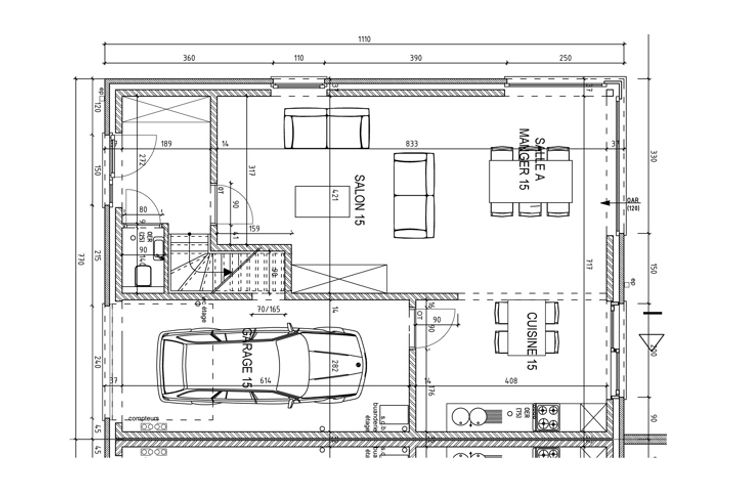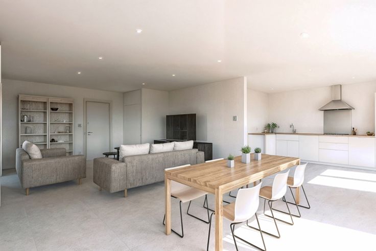 Rez-de-chaussée : hall d'entrée, WC séparé avec lave-mains, séjour avec cuisine équipée ouverte d'une valeur de 6.000€ HTVA, garage, fondation de terrasse prête et jardin non engazonné