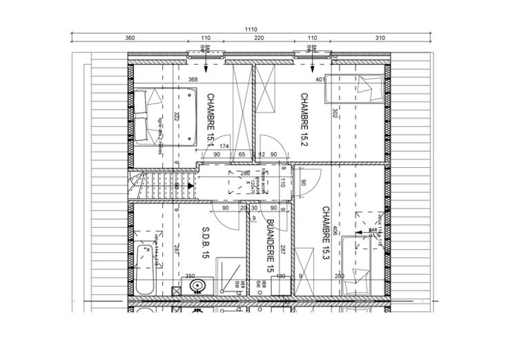 Etage : 3 chambres, salle de bain avec baignoire, douche, meuble vasque, miroir et WC, buanderie, grenier accessible par une trappe