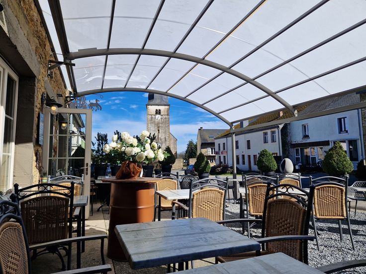 Cet établissement de renom vous accueille par une sympathique terrasse abritée par une élégante pergola permettant de profiter aisément de la quiétude des lieux face à la célèbre église classée datant du 18ème siècle. Pénétrez ensuite au cœur de cette superbe bâtisse en pierres où vous serez immédiatement séduits par l’empreinte du bon goût et du raffinement.