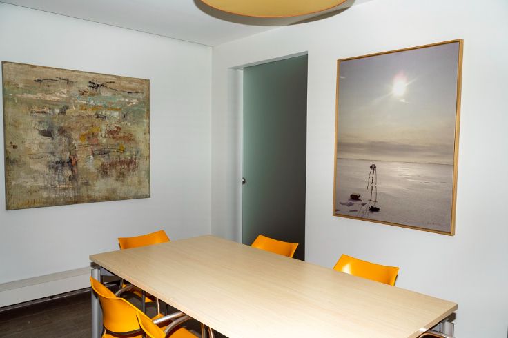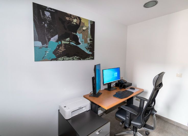 Het kantoor heeft een rechtstreekse toegangsdeur met parlofoon. Twee op maat gemaakte glazen schuifdeuren sluiten het voorin gelegen kantoordeel perfect af.