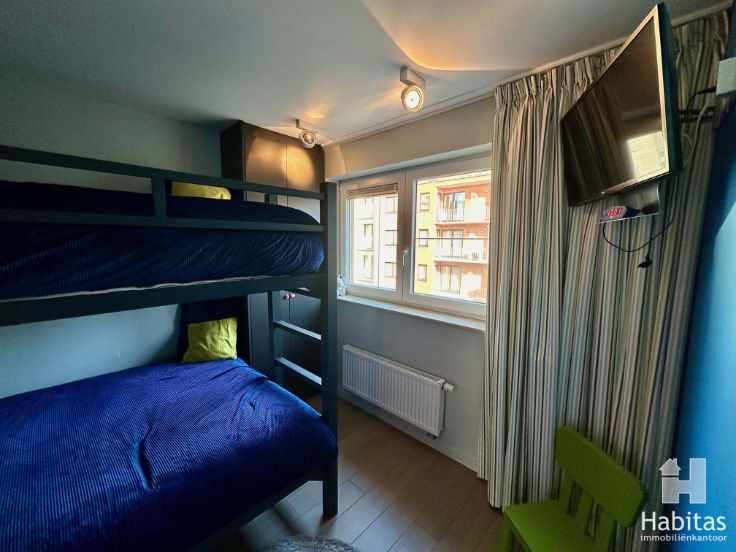 Smaakvol ingericht en bijzonder hoogwaardig afgewerkt appartement, gelegen pal in het centrum van Wenduine, op enkel passen van het strand. Dit zongericht appartement, gelegen op de 3de verd. van de kleinschalige residentie "Blanke Zeiler" omvat: een uitnodigende en lichtrijke woonkamer met inbouw gashaard, zongericht terras met elektrische zonneluifel en open uitzicht, volledig ingerichte keukenhoek, ruime berging, inkomhall met afzonderlijk toilet, stijlvol ingerichte badkamer met ruime inloopdouche en aansl. wasmachine, 2 slaapkamers met elektrische rolluiken en individuele cv op gas. Op het gelijkvloers bevindt zich een private berging en de gemeenschappelijke fietsenberging.Dit energiezuinig en instapklaar appartement is beschikbaar vanaf 01/09/2024 en biedt u woonzekerheid