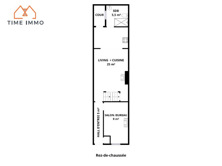 Rez-de-chaussée : Salon, salle à manger ouverte sur la cuisine, salle de douche, couloir