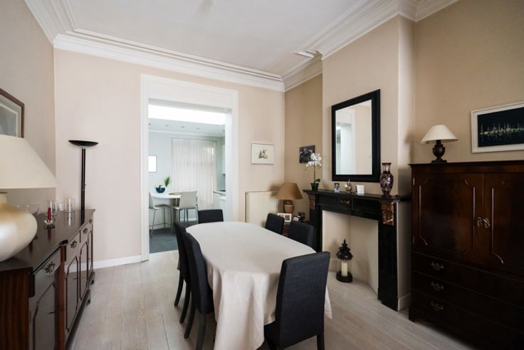 ELSENE, in de onmiddellijke nabijheid van de Place Brugmann en de Place du Châtelain, prachtig WOONHUIS momenteel erkend als VAKANTIEHUIS van 3 eenheden, 2 gevels, met een oppervlakte van ±327m², op een perceel van ±1a25ca en een gevelbreedte van 5,95m. Het omvat op de begane grond (±70m²) een inkomhal met trap, woonkamer bestaande uit twee kamers op een rij van in totaal ±38m² met cassette open haard, open keuken van ±7,5m² met toegang tot het achtergelegen atelier van ±50m2 en apart toilet. Toilet op de tussenverdieping. 1ste verdieping (±50m²): nachthal met trap, slaapkamer n°1 van ±15m² met decoratieve marmeren open haard, badkamer met ligbad, douche en wastafel, slaapkamer n°2 van ±16m² met balkon. Toilet op de tussenverdieping. 2e verdieping (±50m²) : nachthal met trapopgang, slaapkamer 3 (±15m²), badkamer, slaapkamer 4 (±15m²). 3e verdieping (±50m²): casco ruimte met 2 aangrenzende kamers + ruimte voor een badkamer of keuken. 4e verdieping (±50m²) : zelfstandige studio met doucheruimte en keuken. Souterrain (±70m²): diverse kelders voor opslag, ruimte voor een vrij beroep bestaande uit twee kantoren, stookruimte, toilet. Condenserende gasketel. Houten kozijnen. EPB: F. Elektriciteit op peil te brengen. Exclusieve aanbieding van L&P!