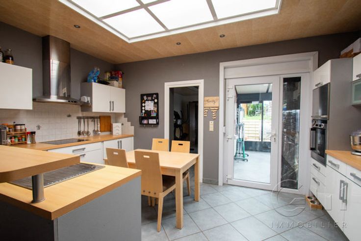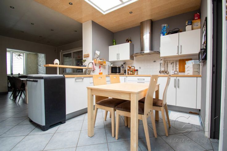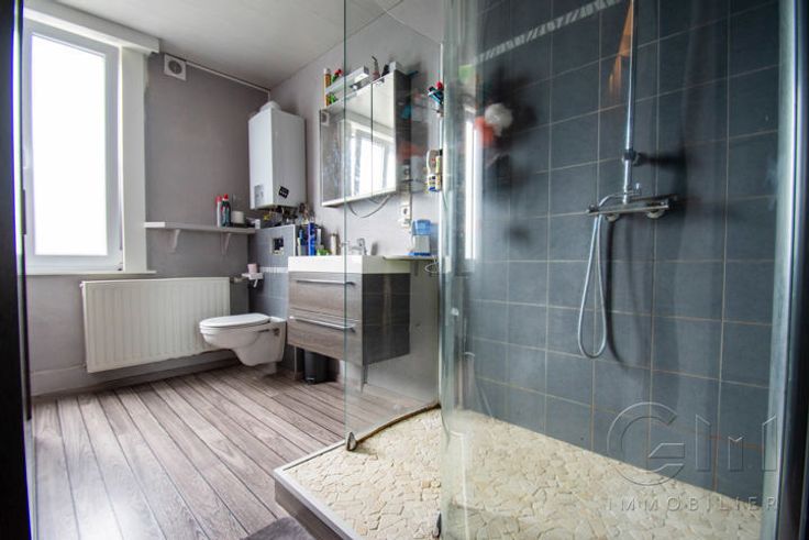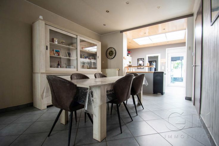 * Particularités : Habitation tout confort située en centre-ville, 3 chambres, 16 panneaux photovoltaïques, châssis PVC double vitrage avec persiennes, chauffage central gaz et chauffe-eau, adoucisseur d'eau, citerne d'eau de pluie relié à un groupe hydrophore, Bon PEB : C, RC : 529€