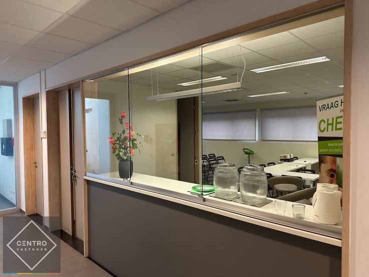 AFWERKING: bevloering met keramische tegels - grote glaspartijen (veel lichtinval) - verlaagd plafond met ingewerkte AIRCO-modules en TL-lampen - aluminium schrijnwerk met dubbele beglazing.