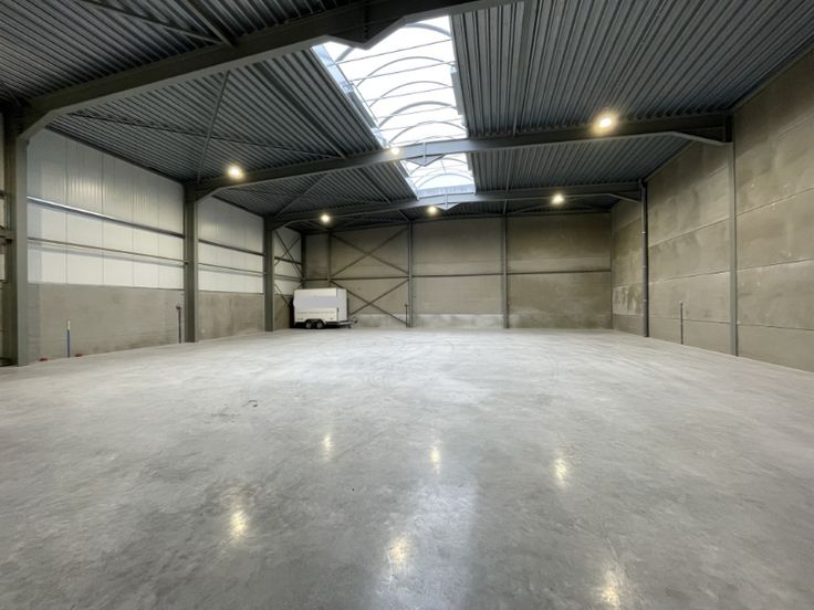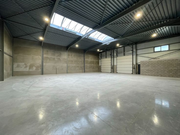 Het magazijn bestaat uit geïsoleerde polybetonvloer met draagkracht van 2.5ton/m², staalstructuur met 6,6m vrije hoogte, 2 automatische sectionaalpoorten 4m x 4.3, aparte ingangsdeur, geïsoleerde steeldek dakstructuur, achteraan geïsoleerde gladgestreken betonstructuur van 30cm; voor- en zijkant bovenaan afgewerkt met geïsoleerde sandwichpanelen (10 cm PIR), grote lichtstraat van +/- 12m, Led verlichting – 2 delen v/d opp kunnen apart ingeschakeld worden, monofasige en drijfkracht stopcontacten zijn voorzien over de ganse oppervlakte, alle nutsvoorzieningen zoals gas, coax, fiber, stads- en regenwater zijn voorzien (aansluitingen door huurder), draaikipraam voorzien voor eventuele mogelijke opbouw van bureau op verdiep, afvoer voorzien voor alle sanitair.