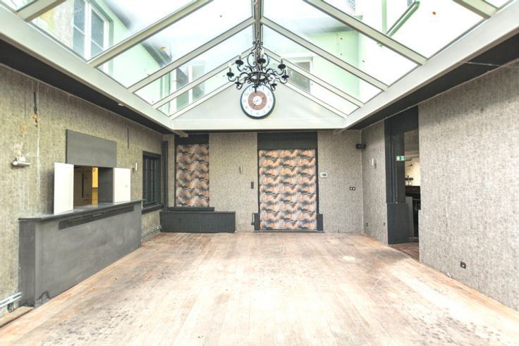 Dit pand omvat op het gelijkvloers een inkomhal, de grote ruimte links (± 70m²) met daar op aansluitend een mooie veranda/wintertuin (± 38m²) met zicht op de achtergelegen tuin/terras. Voorts is er nog een tweede ruimte vooraan (± 20m²), een keuken met bijkeuken en afwaslokaal, en het sanitaire gedeelte met dames- en herentoiletten. Er bestaat tevens de mogelijkheid om vooraan een terras te plaatsen.