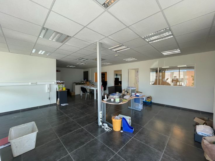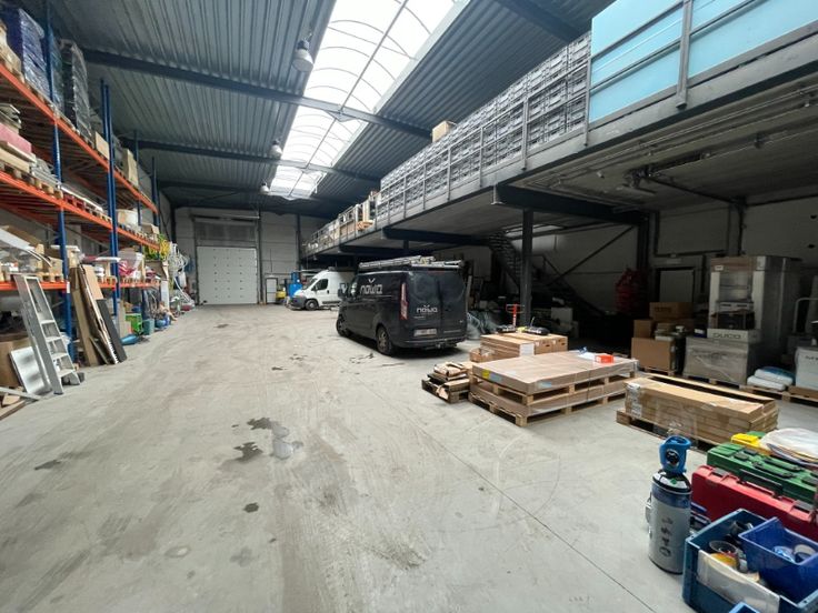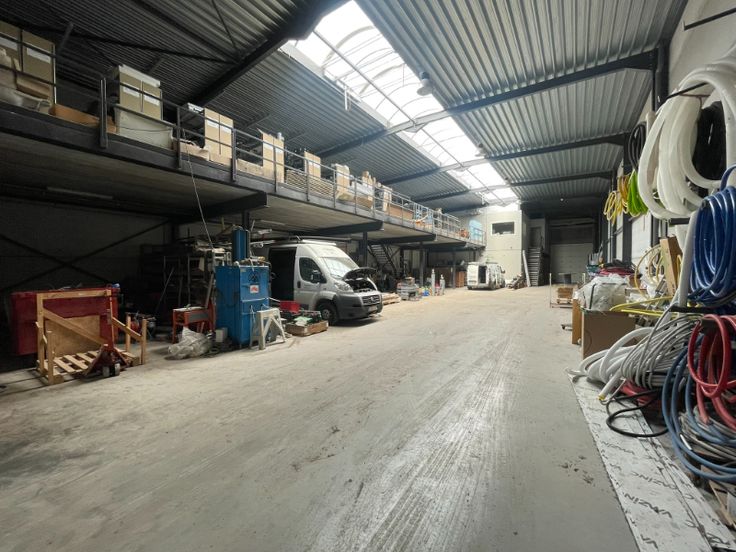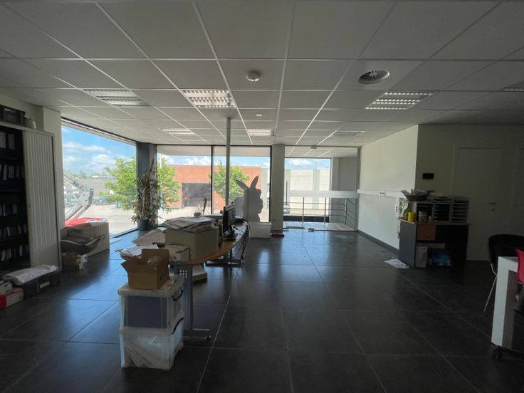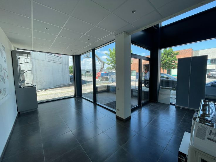 Modern bedrijfsgebouw te koop op bestaande uit 521m² magazijn (opslag) met 186m² mezzanine. Aan de voorzijde een kantoor bestaande uit 124m² gelijkvloers (showroom) en 116m² op eerste verdiep + 4 parkeerplaatsen aan voorzijde en eventueel nog aan de achterzijde, gelegen op een perceel van 1526m².