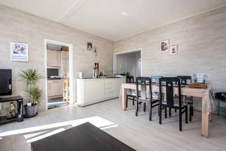 Woonkamer, keuken, tv-ruimte, toilet, badkamer, 2 slaapkamers, 2 bergingen, achterkoer.