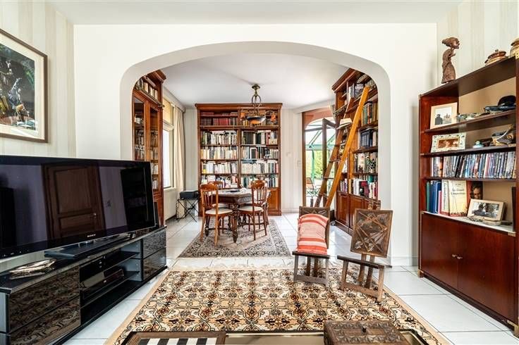 Un hall d’entrée dessert, sur la gauche, un salon avec cheminée en marbre et insert (Flam) et une salle à manger et, sur la droite, une chambre/bureau (parquet, dressing) avec une salle de douche (douche italienne et lavabo) avant de s’ouvrir, au fond, sur une grande cuisine équipée avec séjour dont une large baie vitrée offre une superbe vue sur la véranda et le jardin.