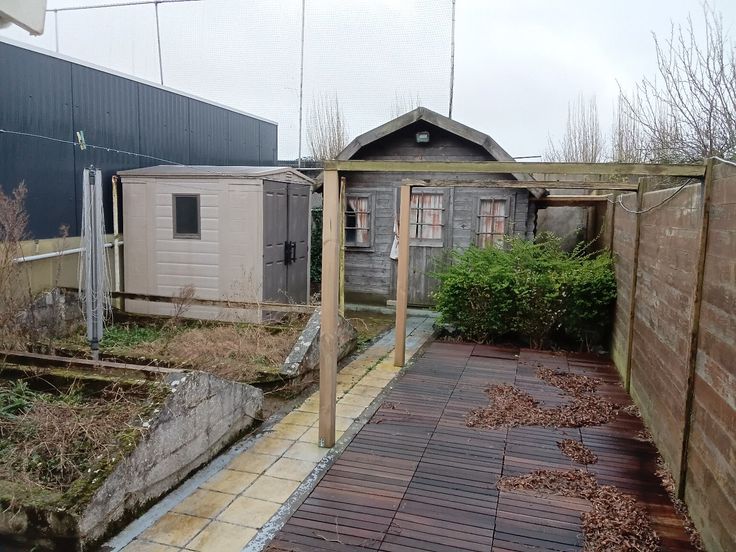 Op 1,5 km van het strand, centraal en zéér rustig in doodlopend straatje gelegen, te verfraaien bungalow met 1 (al naargelang 2) slaapkamer(s), veranda, terras en gezellige tuin met tuinhuis.