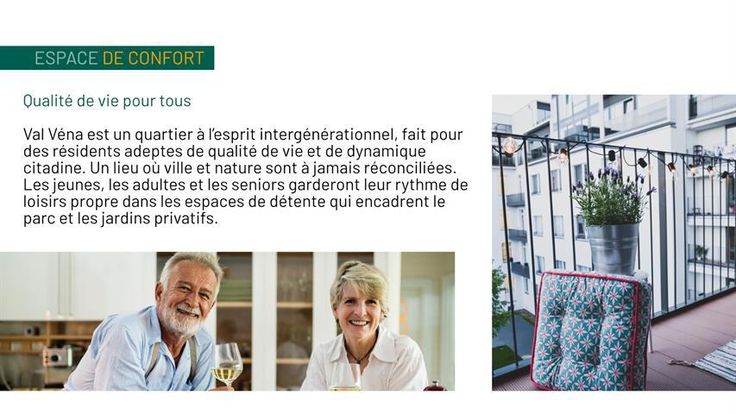Né de la reconversion de l’ancien site Folon à Wavre, Val Véna offre un concept novateur. Ce nouveau quartier est la combinaison parfaite entre les facilités qu’offrent la vie urbaine de Wavre et le calme d’un environnement verdoyant garantissant quiétude et bien être à ses habitants. Les appartements Val Véna (1ch au 3ch et penthouse) sont entourés d’écoles de qualité, de nombreux commerces, d’une gare ferroviaire, d’un centre sportif et culturel tout en préservant l’intimité et le confort. Les plans sont travaillés de manière à ce que les bâtiments procurent à chacun ; ventilation, ensoleillement et éclairage naturel. Avec son look contemporain, le Val Véna offre tous les avantages d’une construction neuve répondant aux normes les plus récentes. Chaque appartement profite d’une belle terrasse. Au programme, des finitions de qualités : parquets et carrelages de qualité dans toutes les pièces, cuisine et salle de bains équipées et buanderie , le tout dans un look moderne et tendance. Le parc au centre de Val Véna incite à la balade et à la circulation douce (à vélo, à pieds, en transport en commun). Sa localisation rend également accessible des destinations telles que Bruxelles et Louvain-la-Neuve avec une facilité dû à sa proximité avec la gare, à la E411 et la N4.