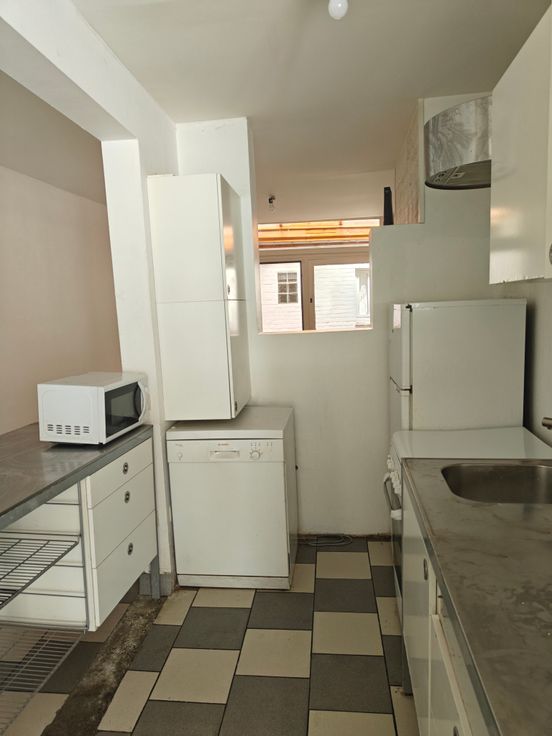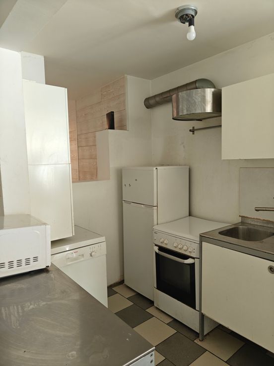 Cuisine équipée de 14 m²: évier, meubles, frigo-surgélateur, lave-vaisselle Bosch, cuisinière au gaz, four électrique et hotte