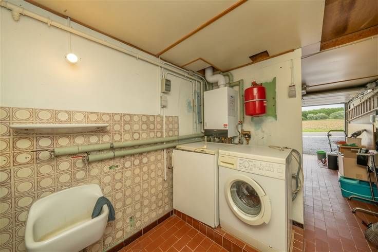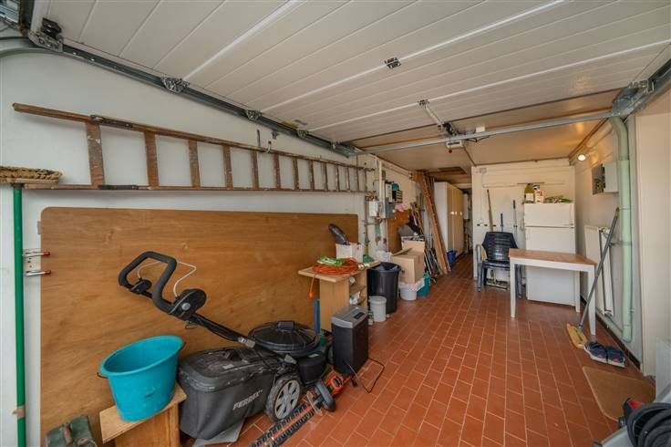 Gelijkvloers (81m2): inkomhall in L-vorm (1m45x2m15) + (0m95x1m30), WC (1m15x1m15) met wastafeltje, mooie living (6m10x5m80) met een schuifraam uitgevend op de tuin, ingerichte keuken (2m90x2m20) aan de voorzijde van de woning, garage (2m55x5m10) met elektrisch bediende poort, was- en stookplaats (2m55x2m35), sas (2m05x1m25) achter de stookruimte met deur naar de tuin, terras en tuin