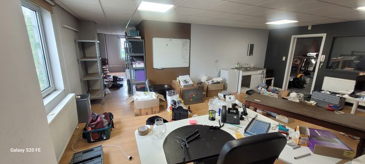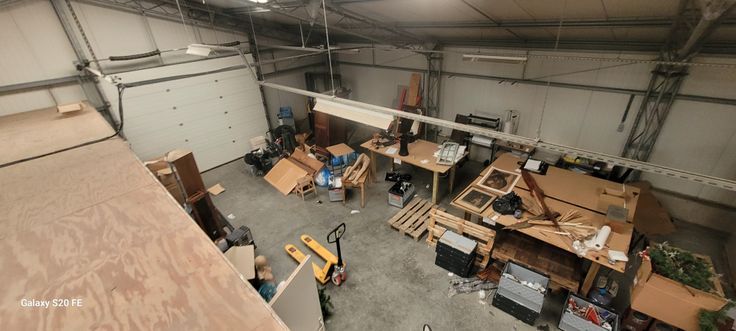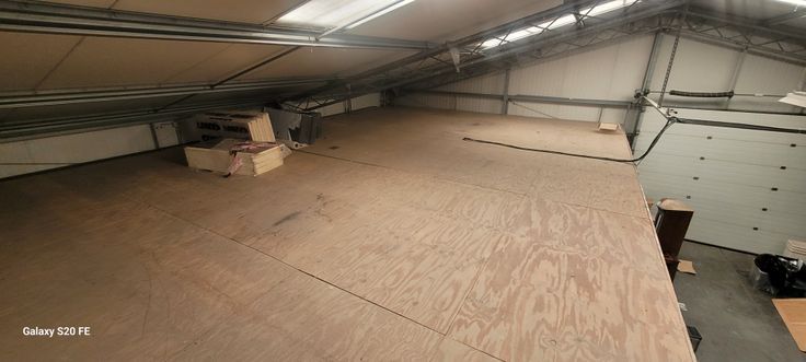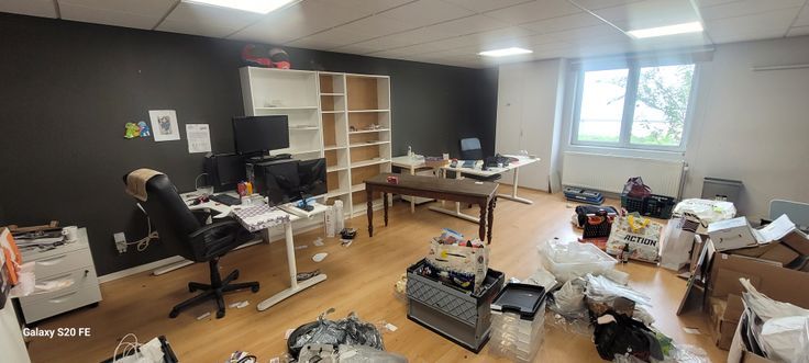 Présence d’un espace de stockage situé au dessus des bureaux et accessible par un escalier en bois.