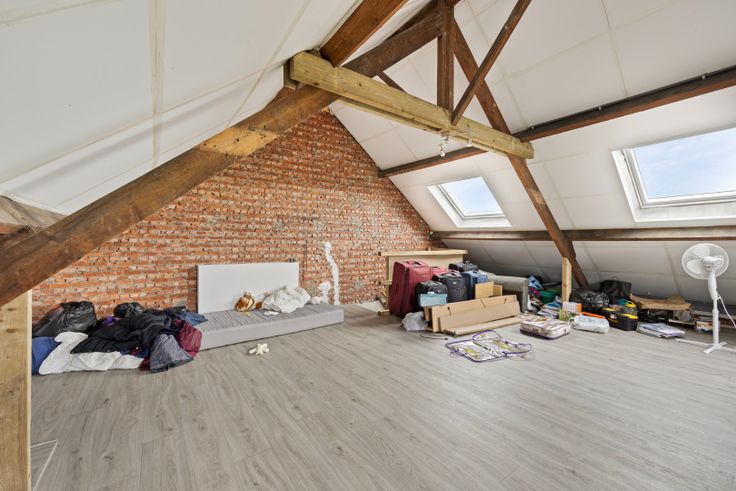 Op het gelijkvloers bevindt zich tot slot ook de basis uitgeruste badkamer. De aanbouw biedt diverse mogelijkheden, zo kan deze ingericht worden als gezellige lees- of zithoek met zicht op de tuin. In de aanbouw bevindt zich tevens de technische installatie. Op de eerste verdieping geeft de nachthal uit op de drie ruime slaapkamers. Via vaste trap komen we terecht op de zolderverdieping welke gebruikt kan worden als extra slaapkamer. De vele ramen zorgen voor voldoende natuurlijk lichtinval in heel de woning.