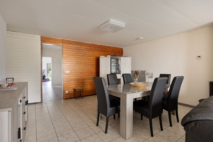 De inkomhal biedt toegang tot de leefruimte, bestaande uit een eethoek en zithoek. Vervolgens komen we in de eetkamer waar zich aansluitend de keuken bevindt, voorzien van een wastafel, vaatwasser, afzuigkap en een elektrische kookplaat. In deze keuken geniet je van een mooi zicht op de tuin.