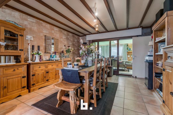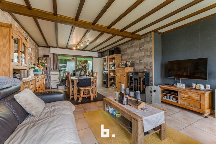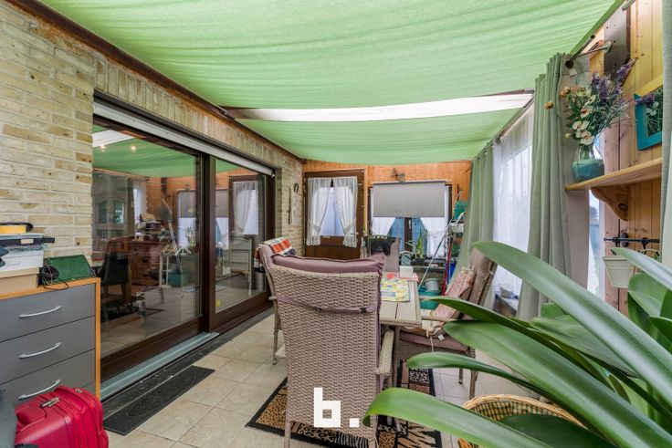 Inkomhal, ruime en lichtrijke leefruimte met toegang tot de veranda, keuken met aansluitende berging, 2 slaapkamers, badkamer, garage met toegang tot de zolder waar nog een extra slaapkamer gemaakt kan worden.