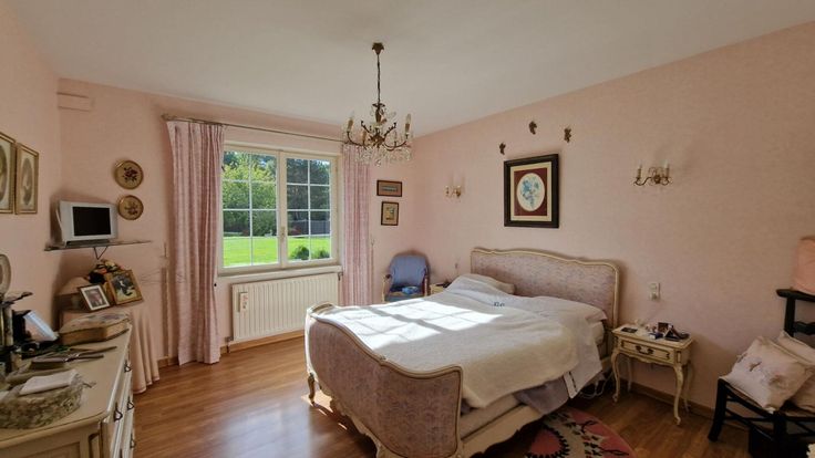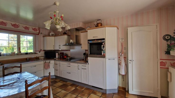 Le sous-sol est entièrement carrelé et l'espace pour trois voitures. Le chauffage chaudière à condensation et un insert.