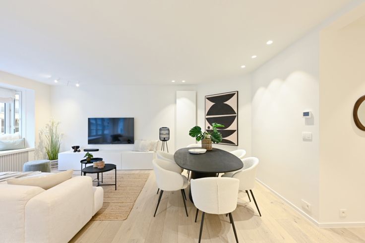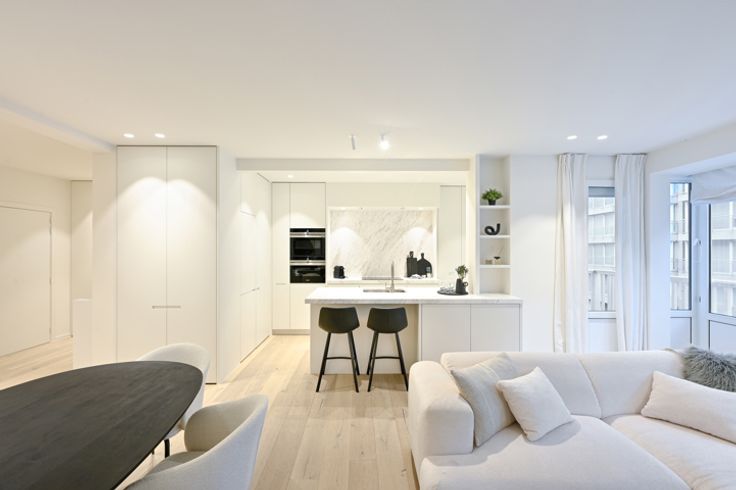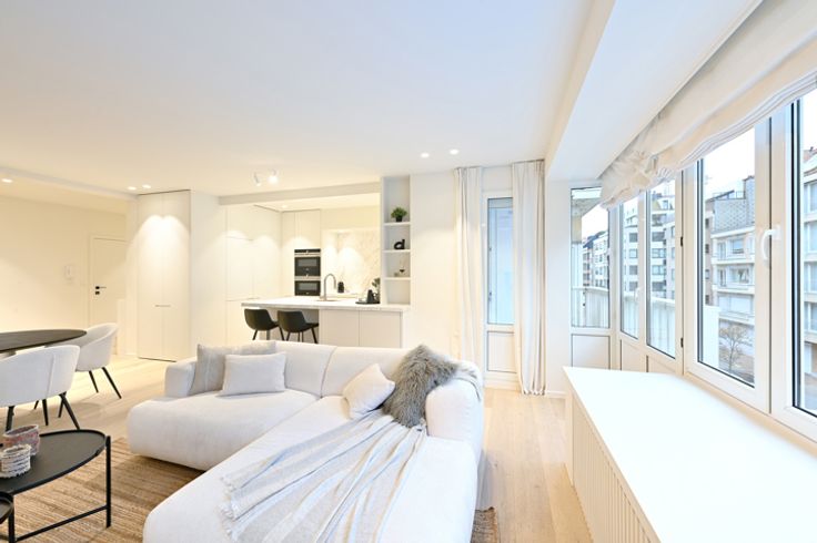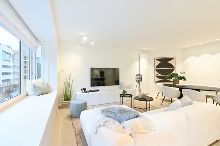 Ruim (115m²) gerenoveerd 3-slaapkamerappartement vlakbij de zeedijk en winkelstraten te Knokke-Heist. Indeling: royale inkomhall met vestiairekasten, berging met aansluiting wasmachine en droogkast, volledig geïnstalleerde moderne open keuken met marmeren werkblad en terrasje vooraan (westgericht - middagzon). Brede woonkamer met eet-en zithoek uitgevend.  3 volwaardige slaapkamers, elk met een buitenraam. Een mooie badkamer met toilet, dubbele wastafel en ruime douche. Tweede douchekamer.  Groot terras aan de achterzijde, waar u kunt genieten van de ochtendzon.  Berging aanwezig in het appartement zelf. Mogelijkheid tot aankoop van een dubbele garagebox op 150 meter.  EPC: 272 kWh/m³ (UC: 2731417)