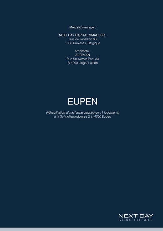 Nous vous présentons une opportunité unique sur le marché immobilier : une magnifique ferme classée, nichée dans le quartier résidentiel paisible d'Eupen. Cette remarquable propriété allie le charme de l'ancien à des équipements modernes de haute qualité. Appartements parfaitement équipés: 78m² à 117m² en 1 ou 2 chambres. Caractéristiques Principales: • 11 Appartements de Standing : Chaque appartement a été méticuleusement conçu pour offrir un confort optimal et un style de vie luxueux, avec des finitions haut de gamme et des espaces lumineux. • Cour Intérieure Authentique : Profitez d'une belle cour intérieure authentique, préservant l'histoire et le caractère de la ferme tout en offrant un espace de détente privilégié pour les résidents. • Quartier Résidentiel Calme : Idéalement située dans un quartier résidentiel calme, cette propriété offre tranquillité et intimité, tout en restant à proximité des commodités et des attractions de la ville. • Parking Privé : 9 places de parking privées à disposition, garantissant commodité et sécurité. • Jardins ou Terrasses Privées : Certains appartements offrent l'accès à des jardins privés, tandis que d'autres disposent de terrasses offrant un extérieur pour chaque appartement. La résidence est idéalement située à Eupen, offrant un accès facile aux centres urbains voisins ainsi qu'à la nature environnante, permettant un équilibre parfait entre vie citadine et tranquillité rurale.