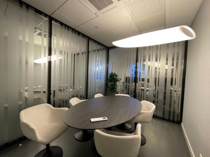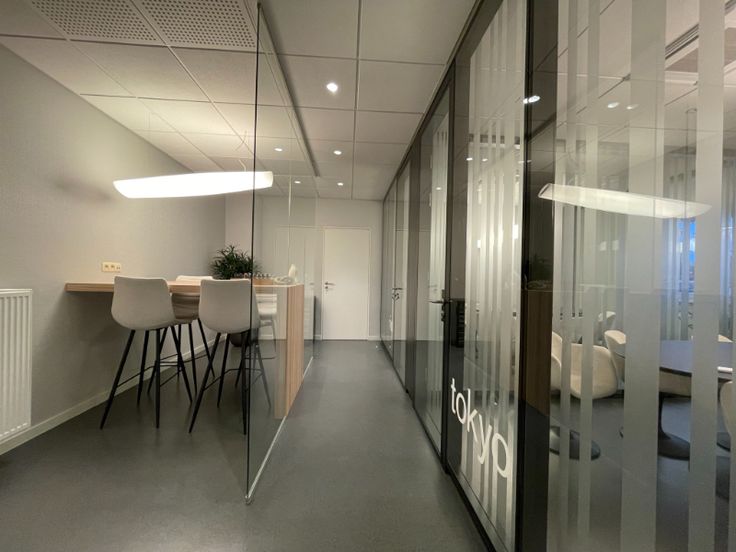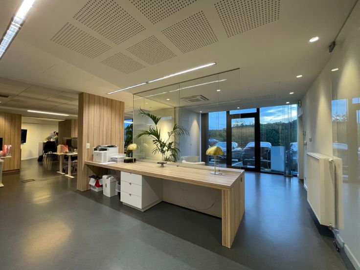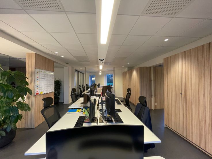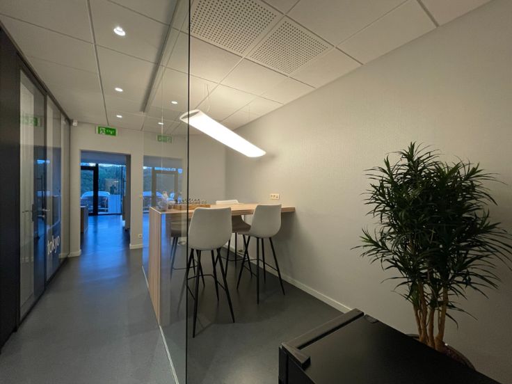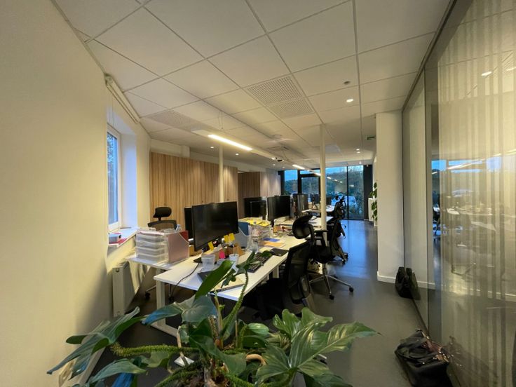 Het kantoor is opgebouwd uit een glasgevel met extra isolerende beglazing en zonnewering, verlaagd plafond met inlegtegels en inbouw tl-armaturen, databekabeling.