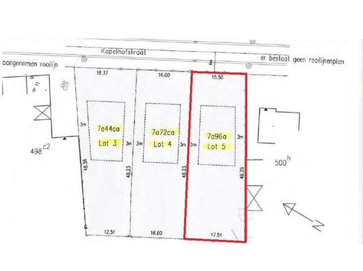 - Aan de straatzijde is er een perceelbreedte van 15,50m en de perceeldiepte bedraagt ca. 48m.