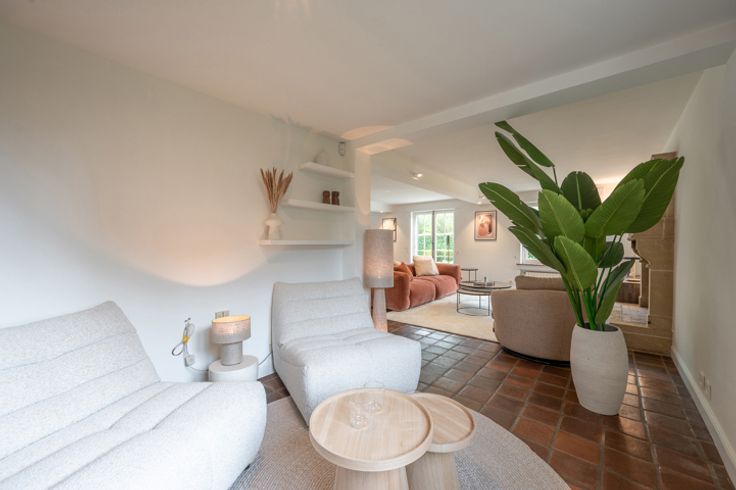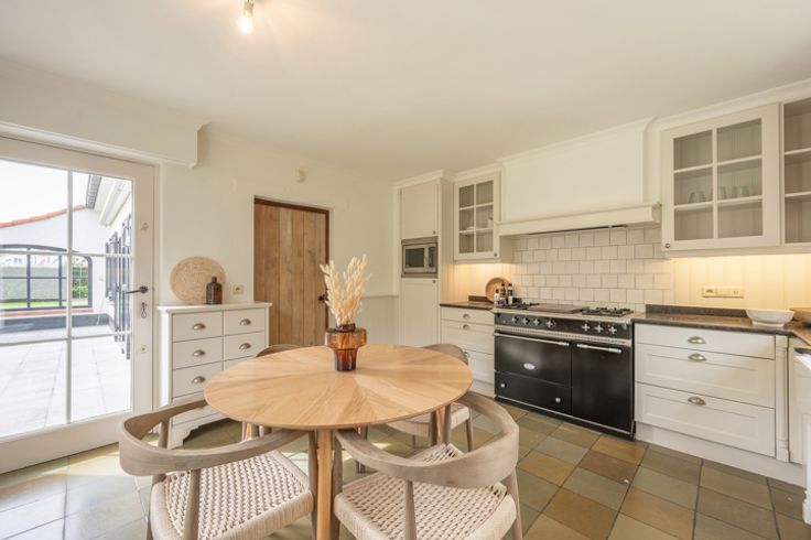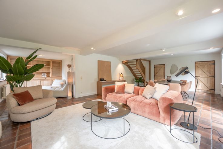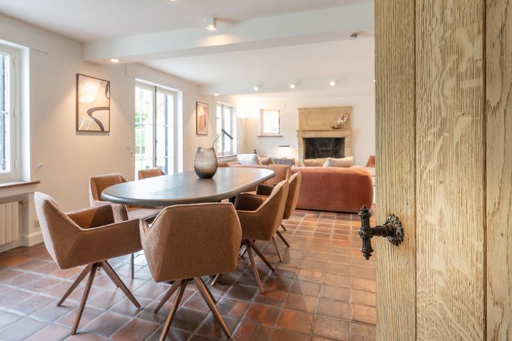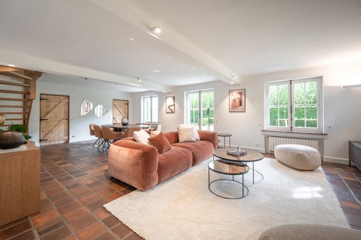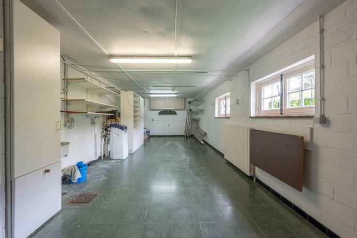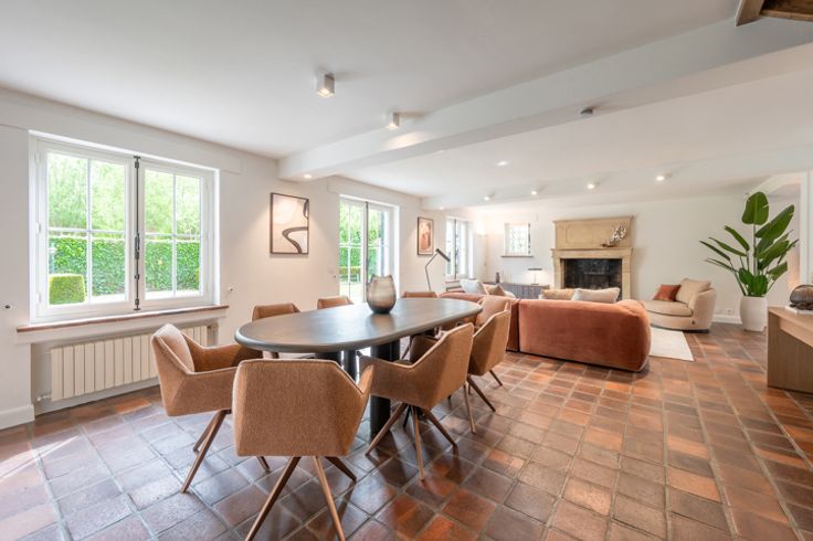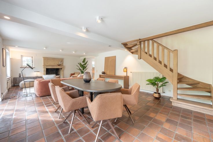 Indeling: inkomhal met vestiaire en gastentoilet, ruime living met open haard en de eetkamer, aparte keuken.