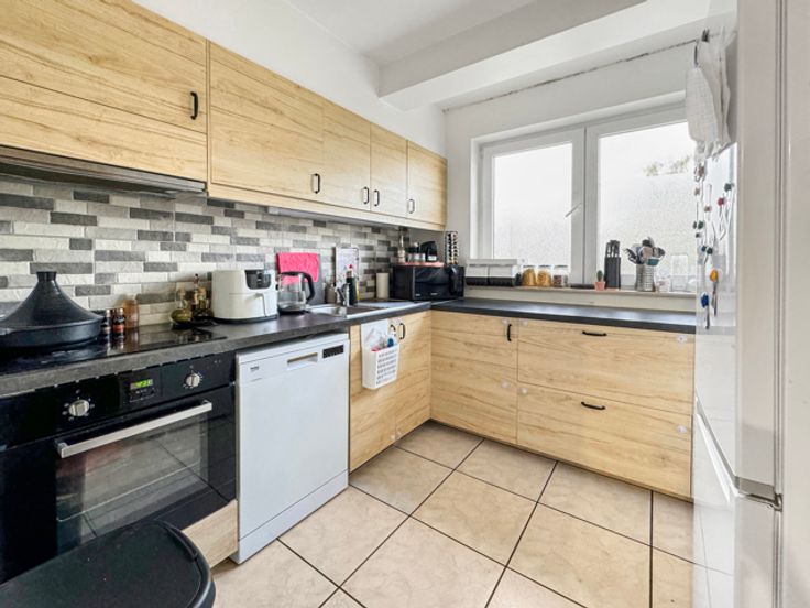 Neder-Over-Heembeek in een klein recent gebouw, 2de verdieping appartement bestaande uit een hal, ingerichte keuken, grote 35 m² woonkamer, 2 slaapkamers, badkamer, wc, garage. PVC ramen met dubbele beglazing. Details voor bezichtiging: Century 21 Best House 02/2682150 info@century21besthouse.be