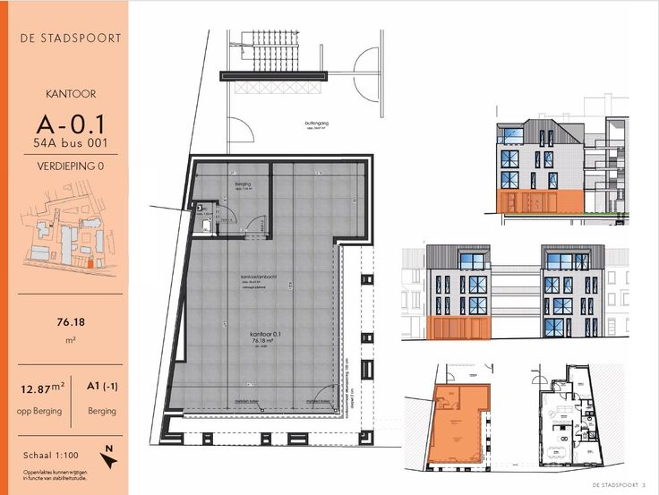 Kantoor A-0.1 heeft een totale oppervlakte van 77 m², verdeeld over 55 m² kantoorruimte, inkomhal, toilet, berging en kelderberging.