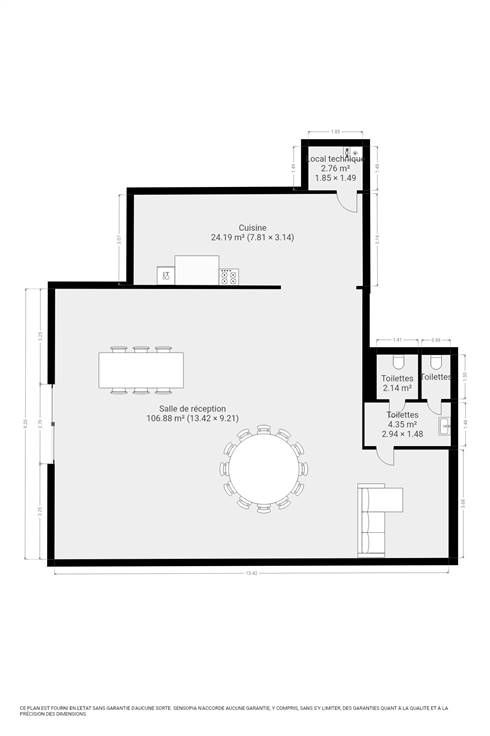 Une pièce polyvalente de plus de 110m², une cuisine semi-équipée, deux WC ainsi qu'un local technique.