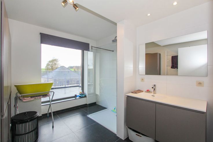 Superbe penthouse de standing d'environ 120 m² offrant trois belles grandes terrasses (+/-31 m², 31 m² et 12 m²) dont une couverte. Au troisième étage d'une résidence "à taille humaine" et à l'architecture recherchée. De construction récente (2015) et disposant de tout le confort moderne, ce bien vous séduira par son vaste séjour lumineux, sa cuisine "USA" moderne et super équipée avec îlot central et son espace bureau. Deux belles chambres (+/-16 m², 12 m²) et une salle d'eau avec douche à l'italienne et placards sur mesure. Beau hall d'entrée avec porte blindée et vidéophone. Terrasses avec vue panoramique pouvant accueillir de nombreux et meubles de jardin. Buanderie, ascenseur, adoucisseur d'eau. Un emplacement de parking en sous-sol (accès via porte automatique) et quatre emplacements de parking extérieurs privatifs. Chaudière individuelle au gaz de ville. Compteurs individuels. Arrêt de bus, commerces et écoles accessibles à pied. E40 et E411 à 10', gares à Tienen et Gembloux. Provision de charges : 150 € / mois (communs)