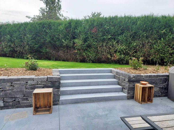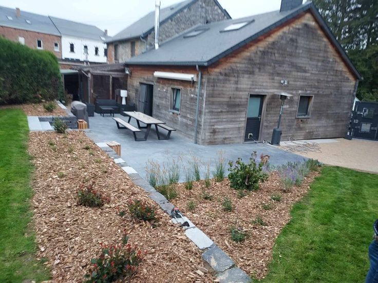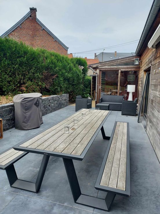 Voor de buitenkant. Voldoende parkeergelegenheid aan de voorzijde. Aan de achterzijde: groot terras in glad beton (gezaagd in grote platen van 1m/1m), droogstenen muur, grote blauwe stenen trap, diverse bloembedden met beplanting, niet-strepend bamboe privacyscherm (in volle groei), technische grindpaden bedekt met okerkleurige grind, tuinhuisje achter de veranda.