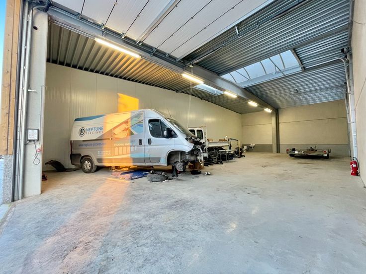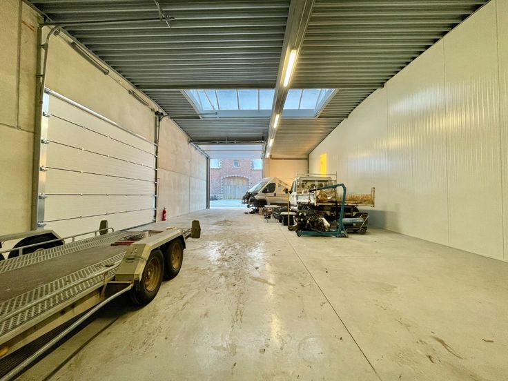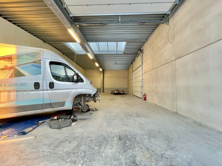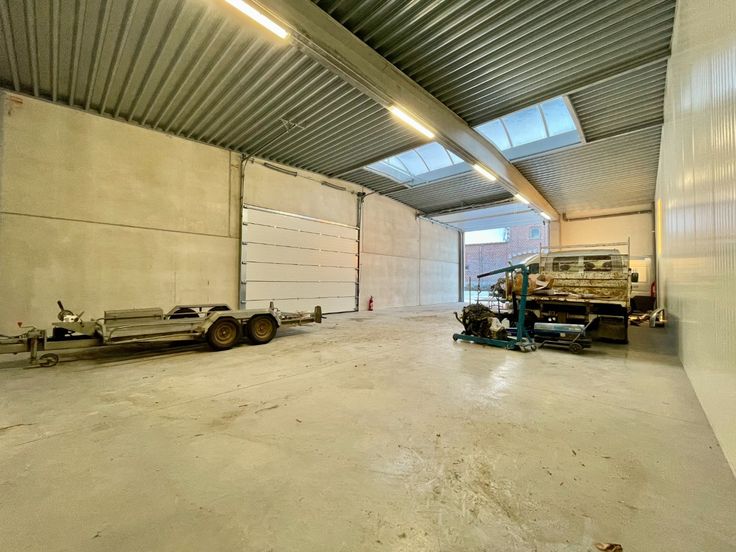 Te huur ruim, afgewerkt magazijn met automatische poort gelegen te Dergneau