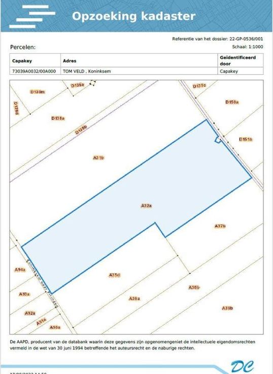 STAD TONGEREN, tweede afdeling, deelgemeente KONINKSEM Een perceel landbouwgrond gelegen Tom Veld, gekadastreerd volgens recent kadastraal uittreksel sectie A, nummer 0032AP0000, met een oppervlakte van twee hectare zevenentwintig are tweeënzestig centiare (2 ha 27 a 62 ca). Niet-geïndexeerd kadastraal inkomen: honderd achtenzestig euro (€ 168,00). Bereikbaar zowel aan de voor- als achterkant van het perceel via de ruilverkavelingsweg “Koninksem naar Piringen”. Verpacht Vraagprijs: €125.000 P score: A
